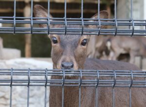 降りたところでシカがお出迎え。近くの渡部商店でシカの餌を購入し、餌やり体験。